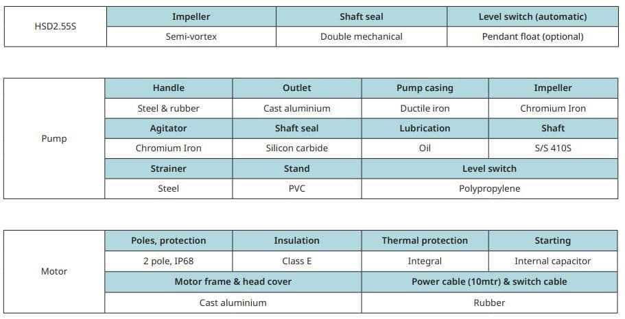 Featuring the Tsurumi patented design, the HSD2.5S includes the double oil bathed mechanical seal with oil lifter arrangement. This provides positive seal lubrication in any position, meaning that the Tsurumi HSD2.5S can be operated both vertically or horizontal on its side.
