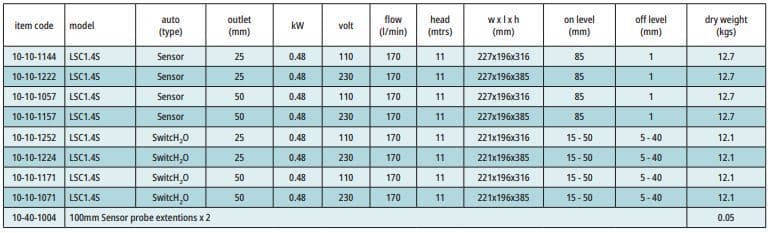 | Model | Voltage | Manual / Auto | Outlet (mm) | kW | Flow (l/min) | Head (metres) | Free Passage (mm) | Dia x H (mm) | Dry weight (kg) | Packing weight |