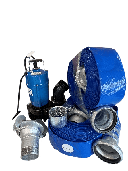 Built around the legendary Tsurumi HS3.75 SL 3″ dirty-water submersible pump, this complete kit includes a Bauer-type outlet coupling collar, plus 50 m of 3″ heavy-duty blue layflat hose (2 × 25 m rolls) pre-assembled with Bauer-type Lever-Lock quick-release fittings.