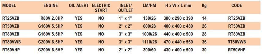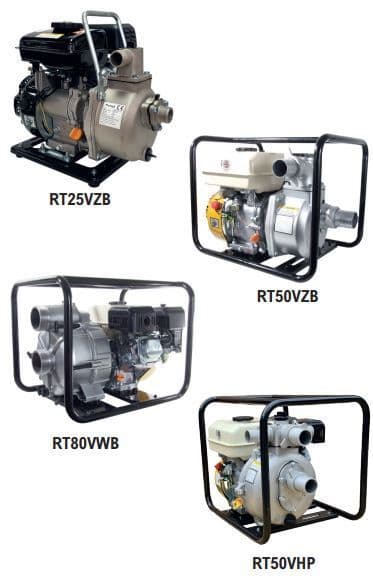The RT50 is a Villiers powered high quality 2" self priming engine driven pump. Capable of pumping a maximum of 600 lt per minute, or to a maximum head of 30m whereas our Villiers RT25 model is a 1 inch version without crash frame but comfortable carry handle.