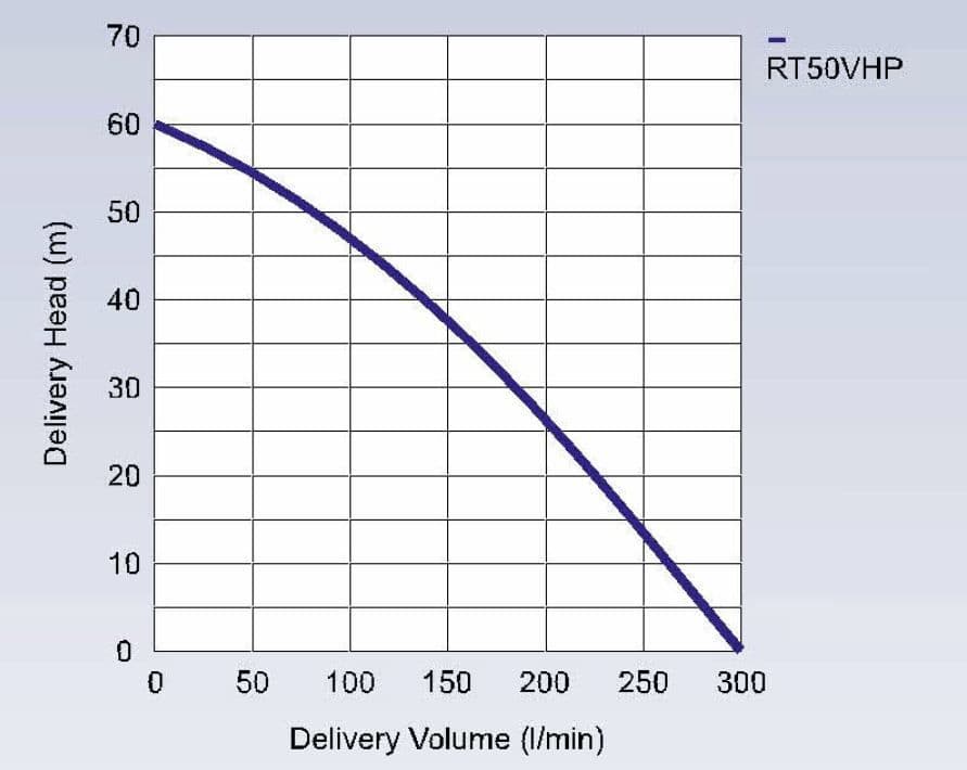 Self-priming, supplied with a strainer in the box, the RT50VHP in this section can produce 6 bar pressure (60 metre head) and a flow rate of up to 300 l/min.