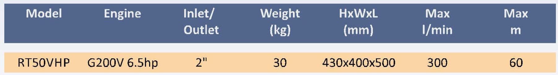 The RT50VHP model, engineered with Villiers high performance engines are a range of specially produced twin impeller pump sets that are supplied with petrol driven engines designed for high pressure applications such as fire fighting, irrigation, booster sets, orchard cultivation, washing down of cattle/barns, pumping water from wells and so on.